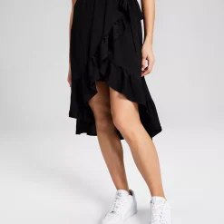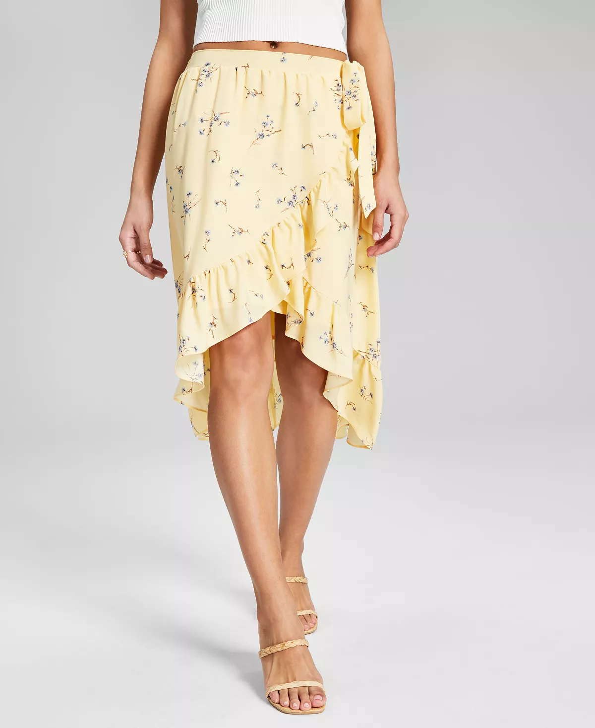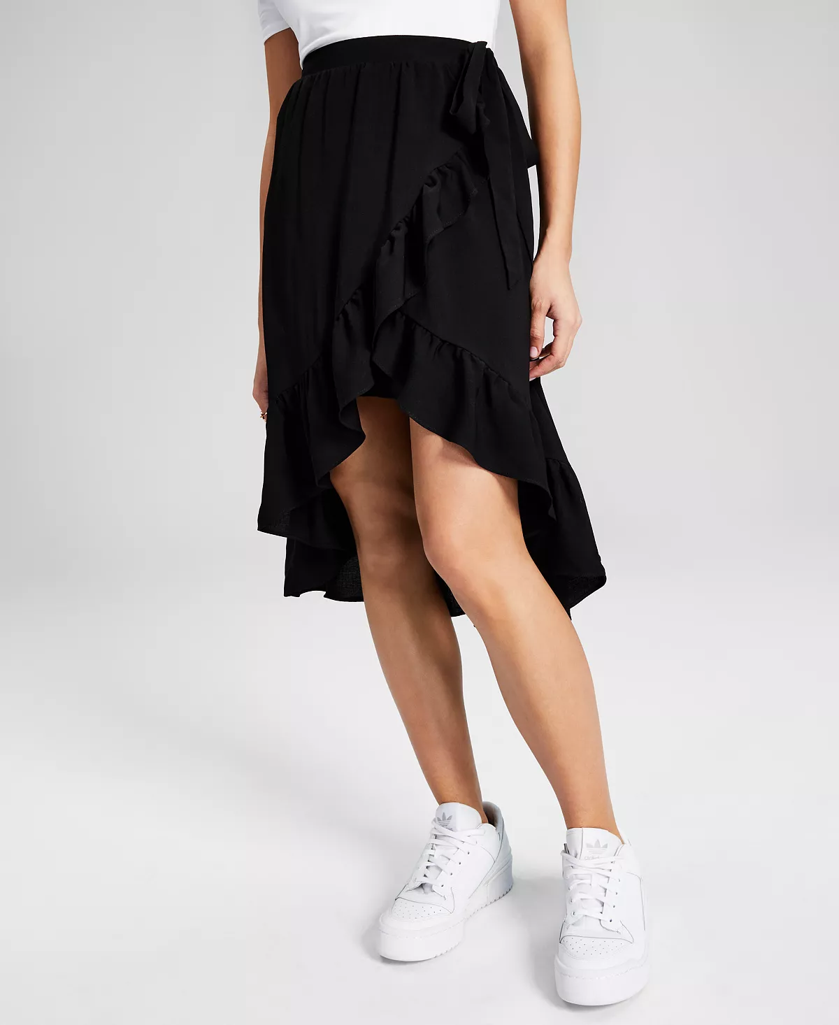 - Tie at side waist; ruffle-trim high-low hem