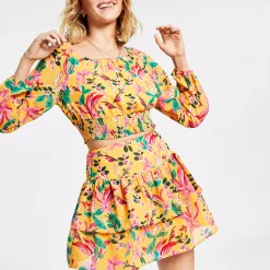 Cheerful florals and a tiered, ruffled hem team up to make magic in this sweet mini skirt from Bar III.