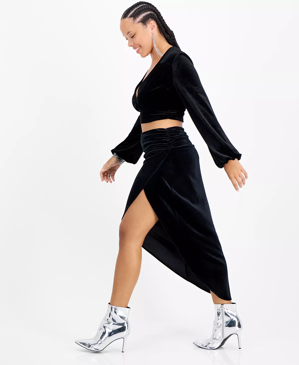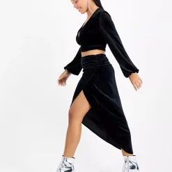 Accented with a slit at front leg, Bar III’s velvet midi skirt is soft to the touch and appealing to the eye.