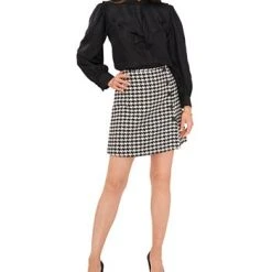Timeless houndstooth gets a fresh edge from Vince Camuto. This mini skirt accents a classic motif with decorative buttons at the front.