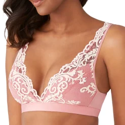 Beautiful lace trims a plunging neckline on Wacoal’s wire-free bralette, perfect for peekaboo style with all-day comfort. Style #810322