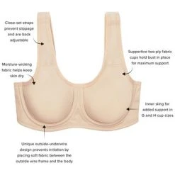 - Cups: Two-ply fabric cups with outside underwire frame to keep breast motion to a minimum